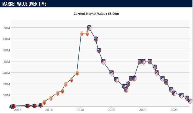 但没有想到,接下来他便完全成为了水货。先是逐渐不适应西蒙尼的战术体系,然后在西甲赛场上水土不服。数据大幅度缩水的同时,球场表现一落千丈。而且更糟糕的是,球员也频繁受到伤病的困扰。巅峰期他的身价曾高达7000万欧,但在最新一期的德转勒马尔只剩下了500万欧的身价。几年下来缩水6500万欧,这确实是非常夸张的。单就水货程度来说,并不逊色于前面提到的几位球星。